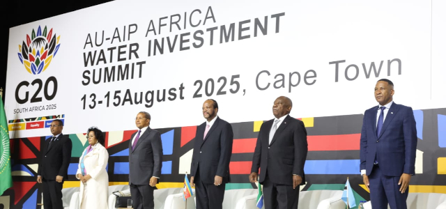 Heads of State & Government, and heads of Institutions at the AU-AIP Africa Water Investment Summit 2025. In the picture (R-L): H.E Duma Boko, President of Botswana, H.E Cyril Ramaphosa, President of South Africa, and then G20 President and host of the Summit, HRH King Mswati III of Eswatini, H.E Jakaya Kikwete, Former President of Tanzanian, H.E Nardos Bekele Thomas, CEO of AUDA-NEPAD, and H.E Jibril Abdirashid Haji Abdi, Deputy Prime Minister of Somalia