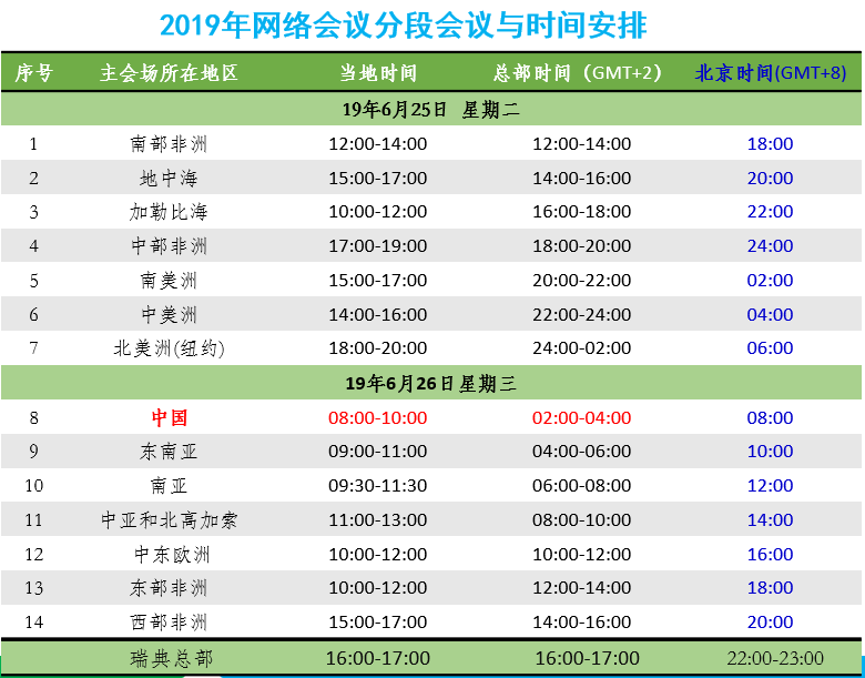 环球在线网络会议将遵循太阳的运动轨迹,分时区连线十三个地区的伙伴单位代表,进行实时对话。每个地区安排 2小时做交流(时间和语言以当地为准),具体可参照会议安排表